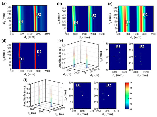 Imaging results of experimental signals using (a) DAS, (b) EVD, (c) RAPID, (d) MUSIC, (e) MOMPI, and (f) MHSRI.