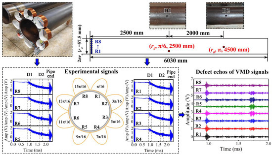 Eight copper wire coils were wound as receiving sensors and evenly arranged along the pipe circumference, as depicted in the upper left of Figure 13. Two circular defects with a radius of 10 mm and a depth of 3 mm were intentionally introduced on the pipe. Their coordinates in the cylindrical coordinate system are (ro, π/6, 2500 mm) and (ro, π, 4500 mm), while their coordinates in the plane of the unfolded plane are (2500 mm, 30 mm) and (4500 mm, 180 mm). UGW testing was conducted on the defective pipe to capture the measured signals R1–R8 shown in the lower left of Figure 13. It is evident that apart from the incident wave, defect echo, and pipe end echo signals present in the experimental signals, there exists significant noise that complicates defect identification. Given that defects are the most critical feature of the pipe, we propose preprocessing the experimental signals using variational mode decomposition (VMD) to reduce non-coherent noise and obtain signals around the center frequency [45]. Additionally, the time window function can be applied to obtain the signals that only contain defect echoes, as illustrated in the lower right of Figure 13.