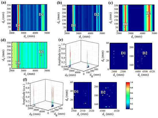 Imaging results of synthetic signals using (a) DAS, (b) EVD, (c) RAPID, (d) MUSIC, (e) MOMPI, and (f) MHSRI.