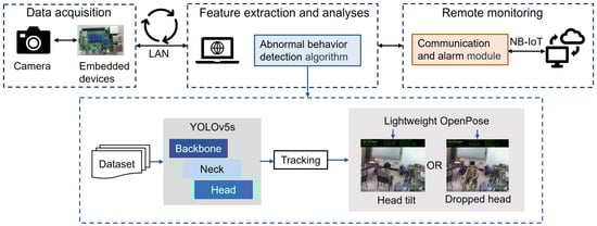 This paper proposes an abnormal behavior detection network called NABNet based on YOLOv5s and Lightweight OpenPose for detecting head tilt postures of sedentary people in indoor scenarios. Furthermore, we present a NABNet-based IoT system that leverages the trained NABNet and hardware equipment, as shown in Figure 1. Video is collected by a camera and processed on edge devices to detect abnormal behaviors, with the results uploaded to the cloud for issuing alarms. The system’s main components are video gathering, image transmission and processing, and NABNet-based detection parts. Based on the YOLOv5s object detection network and the Lightweight OpenPose pose estimation network, NABNet extracts the detailed behavior characteristics of the head and neck from global to local to detect abnormal head tilt and dropped head behaviors.