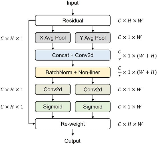 - Hou, Q.; Zhou, D.; Feng, J. Coordinate attention for efficient mobile network design. In Proceedings of the IEEE/CVF Conference on Computer Vision and Pattern Recognition, Nashville, TN, USA, 25 June 2021; pp. 13713–13722. [Google Scholar]