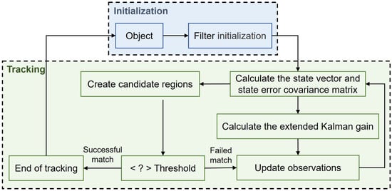 We track the object to analyze the behavior category according to the object’s motion mode. For this, we design an extended Kalman filter-based tracker, as shown in Figure 3. The tracking process is divided into two parts: initialization and tracking; in this paper, the frame of YOLOv5s detection failure is taken as the third frame of the tracker, while the first two frames are taken as the tracker’s initial state. After initialization, the prior state and error covariance matrix are calculated, and multiple candidate regions are created near the preceding state. The candidate region is matched with the tracking result of the previous frame using the difference hash to select the best-matching candidate region. The matching value is compared with a threshold. If this threshold is exceeded, the best-matching candidate region is used as the observation value to update the system; otherwise, the matching is considered to have failed, and waiting for the detector to detect the object again is necessary.