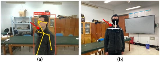Because the neck has subtle movements, using the object detection method directly is impossible, as it can only make judgments based on violent movements (see Section 3.2). Inspired by Maji D. et al. [], this paper uses the YOLOv5s object detection model combined with the Lightweight OpenPose pose estimation method [,] to determine the neck’s state. The advantages of this approach are as follows: (1) combining YOLOv5s with Lightweight OpenPose increases the robustness of the model against occlusion compared to using Lightweight OpenPose alone, which can cause detection errors if key points and joint information are lost; (2) having Lightweight OpenPose only process the objects extracted by YOLOv5s helps it to ignore irrelevant objects, which reduces the amount of calculation and improves real-time performance.