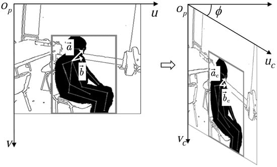 We determine abnormal behavior according to the neck angle. The evaluation criteria of the dropped head state consist of the ratio of the neck-to-nose vector to the vector from the neck to the shoulder on one side. The evaluation criteria of the head tilt state are the angle between the neck and the shoulder. When the camera is not in the front position of the object, there is a difference between the detected angle and the actual angle of the neck, as shown in Figure 4. To solve this problem, we first determine the body’s orientation, then use the camera calibration to obtain the mapping relationship between the two-dimensional and three-dimensional object, and finally obtain the angle between the object and the camera by calculating the Euler angle. Then, the angle correction is carried out by affine transformation [] to reduce the timidity of the angles, as shown in Figure 5. The affine transformation is as follows: