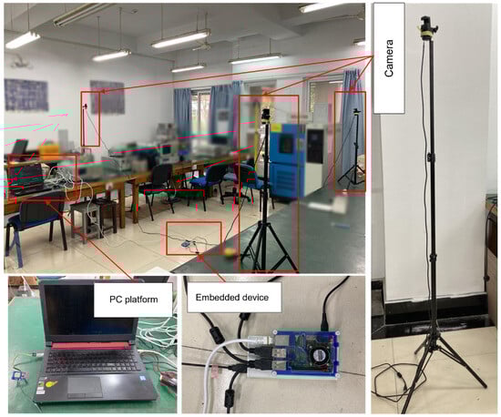 We conducted field experiments to evaluate the effectiveness of our approach, consisting of a camera and 1.7 m bracket, embedded devices, and a computer, as shown in Figure 7. We selected 80 participants, including 60 males and 20 females, aged between 24 and 30 years old and varying in height between 1.55 m and 1.85 m. The participants performed positive pose (head tilt or dropped head) and negative pose (front position) at distances of 0.5 m and 0.75 m from the camera.