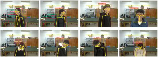 The participants performed positive and negative poses facing the camera in the front position, 30° right rotation, 30° left rotation, 60° right rotation, and 60° left rotation, as shown in Figure 8. The sample number was 160 (80 persons × two poses). The experimental results in Table 2 show that the detection accuracy in the front position and at 30° rotation is higher than that at 60° rotation. In general, as the rotation angle increases, the detection accuracy gradually decreases.