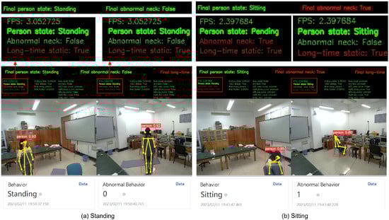 Figure 9 shows the abnormal behavior neck detection results obtained with our multi-node system; (a) shows results for the control group when the participant is standing and is detected correctly by the system, while (b) shows the results when the participants are partially occluded. In the latter case, the system is still able to detect abnormal behavior of the neck. The multi-node detection and final results are shown above the monitoring video, with the final result comprising a comprehensive judgment of the multi-node detection results. The remote monitoring data on the cloud platform are shown below the monitoring video, indicating whether an abnormal behavior event occurs and an alarm was realized.