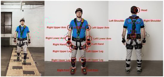 On the left side, one can see the set-up of a slip, trip, and misstep parkour, including an overhead safety system (ceiling) at one cooperation partner’s premises [49]. On the right side, the 17 Xsens Link sensor locations are highlighted.