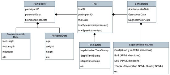 In this project, we gathered multiple kinds of data: raw sensor data from trials and time stamps for important events like hazard activation and the steps taken, personal data (see Table 2), and biomechanical data from the participants. The dataset was further enriched with calculated ergonomic metrics. An overview of the dataset in the form of an entity–relationship diagram can be seen in Figure 3.