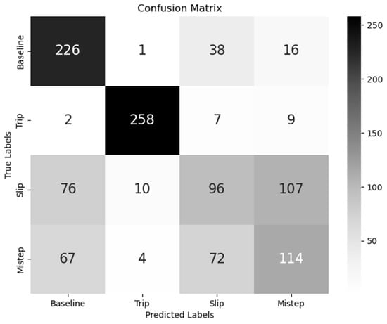 The accuracy results show that tripping is the most easily distinguished from baseline walking and proved successful even when all four classes are assessed concurrently (see Figure 2). In contrast, sliding and misstepping are significantly harder to differentiate, with considerably lower accuracies and substantial misclassification rates in the four-class scenario.