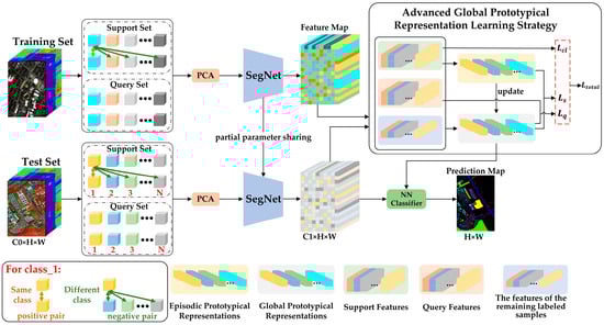 In the AGPS framework, SegNet serves as the feature extractor, responsible for extracting the spatial-spectral features of HSI. It generates a feature vector for each pixel in the HSI. The resultant feature map retains the same dimensions as the initial HSI, and each feature vector in the feature map corresponds to the pixel at the respective position in the original HSI. The advanced global prototypical representation learning strategy optimizes SegNet through three different constraints, which are realized via three different loss functions. Specifically, in each episode, labeled samples are randomly selected from the dataset and divided into support and query sets (in Figure 1, the cubes of the same color in the support set and the query set represent samples from the same class). By taking the mean of the feature vectors of all labeled samples for each category in the dataset, we obtain the global prototypical representation feature vector for each category. Similarly, by taking the mean of the feature vectors of the samples for each category in the support set, we obtain the episodic prototypical representation feature vector for each category. The cross-entropy loss between the episodic prototypical representations and the global prototypical representations is calculated to obtain the support set loss . Subsequently, the global prototypical representations are updated based on their similarity to the episodic prototypical representations. The query set loss is obtained by calculating the cross-entropy loss between the query set samples and the updated global prototypical representations. The contrast loss is obtained by calculating the noise contrast estimation loss among the support set samples. Therefore, the total loss in an episode is the sum of , , and . The network parameters are finally updated using the total loss .