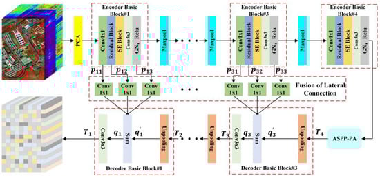 where represents the output of Decoder Basic Block#, represents the feature map processed by the ASPP-PA module, represents the output of the module in Encoder Basic Block#, represents the 2× upsampling operation, represents for a 1 × 1 convolutional layer, and represents a 3 × 3 convolutional layer.