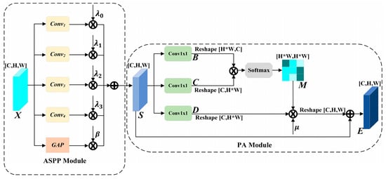 To further integrate , we sequentially attach a PA module after the ASPP module to obtain the spatial dependencies among features at different locations within . The feature map , which integrates multi-scale information, is initially processed by a convolutional layer and subsequently undergoes a shape transformation to yield two novel feature mappings, and , where . Here, = represents the total pixels count of . Subsequently, the new feature mapping matrices and are multiplied, and the resulting product is then normalized to produce the spatial position attention map :