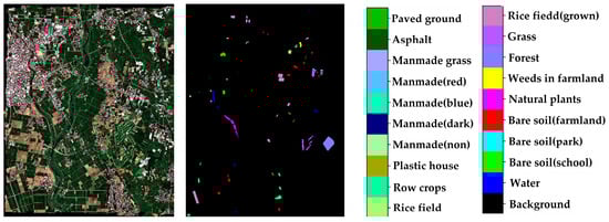 - Chikusei Dataset: The spectral range of this dataset is 343–1080 nm, with a spatial resolution of approximately 2.5 m. This dataset size is 2571 × 2335, consisting of 128 spectral bands. The Chikusei dataset is divided into 19 land cover classes. Figure 4 shows the false-color image and the ground truth of the Chikusei dataset.