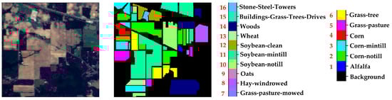 Figure 5. IP data set. The black font indicates the category name, and the red font indicates the category serial number. - Salinas (SA) Dataset: The spectral range of this dataset is 400–2500 nm, with a spatial resolution of approximately 3.7 m. This dataset size is 512 × 217, consisting of 224 spectral bands. After removing the bands with severe water vapor absorption, there are 204 bands left. This dataset contains 16 land cover classes. Figure 6 shows the false-color image and the ground truth of the Salinas dataset.