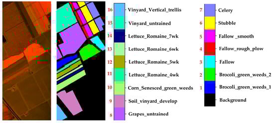 Figure 6. SA data set. The black font indicates the category name, and the red font indicates the category serial number. - University of Pavia (UP) Dataset: The spectral range of this dataset is 430–860 nm, with a spatial resolution of approximately 1.3 m. This dataset size is 610 × 340, consisting of 115 original bands. After removing 12 noisy bands, there are 103 bands left. This dataset contains 9 land cover classes. Figure 7 shows the false-color image and the ground truth of the University of Pavia dataset.