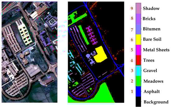 - Indian Pines (IP) Dataset: The spectral range of this dataset is 400–2500 nm, with a spatial resolution of approximately 20 m. This dataset size is 145 × 145, consisting of 200 spectral bands. This dataset contains 16 land cover classes. Figure 5 shows the false-color image and the ground truth of the Indian Pines dataset.