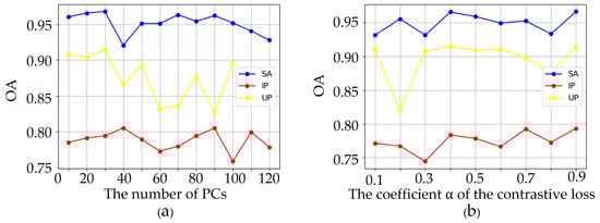We first analyzed the impact of the number of principal components (PCs) preserved after PCA dimensionality reduction on the OA. The number of dimensions of the pre-training dataset Chikusei is 128, so even if the number of dimensions of the SA and IP datasets is greater than 120, we still set the maximum number of PCs of the SA and IP datasets to 120. The number of dimensions of the UP dataset is 103, so we set the maximum number of PCs of the UP dataset to 100. The variation of OA with the number of PCs is shown in Figure 8a. When the number of PCs is 30, the OA of the UP and SA datasets can reach the maximum value. Although the OA of the IP dataset can reach the maximum value when the number of PCs is 40, to ensure that the number of PCs can achieve better results on all three datasets, we set the number of PCs to 30.