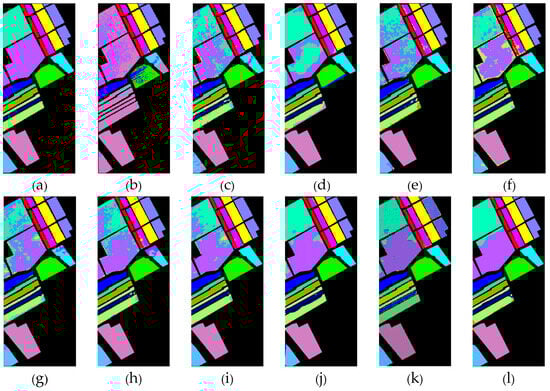 SA (a) Ground-truth. (b–l) Classification maps for different classifiers. (b) SVM. (c) 3D-CNN. (d) FPGA. (e) DFSL. (f) DFSL + SVM. (g) DFSL + NN. (h) DCFSL. (i) CMTL. (j) S3Net. (k) CRSSNet. (l) AGPS.