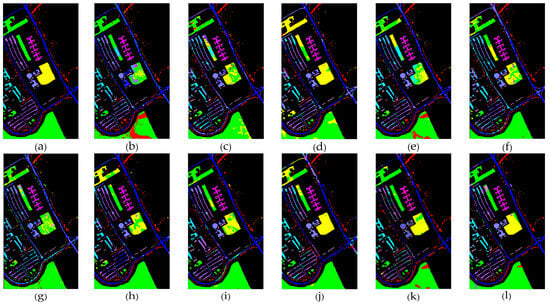 UP (a) Ground-truth. (b–l) Classification maps for different classifiers. (b) SVM. (c) 3D-CNN. (d) FPGA. (e) DFSL. (f) DFSL + SVM. (g) DFSL + NN. (h) DCFSL. (i) CMTL. (j) S3Net. (k) CRSSNet. (l) AGPS.