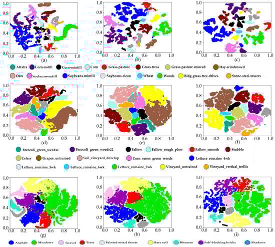 Feature separability for different methods in the three datasets. (a) S3Net, (b) CRSSNet, and (c) AGPS for IP. (d) S3Net, (e) CRSSNet, and (f) AGPS for SA. (g) S3Net, (h) CRSSNet, and (i) AGPS for UP.
