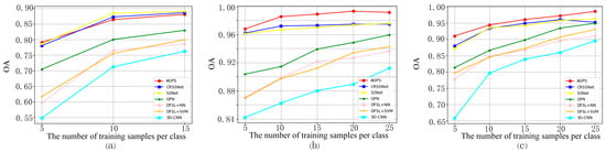 Evolution of OA as a function of number of training samples per class. (a) IP (b) SA (c) UP.