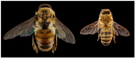 Honeybees Apis mellifera L.: male drone (left) and female worker bee (right). Photography: Beltsville Agriculture Research Center, public domain.