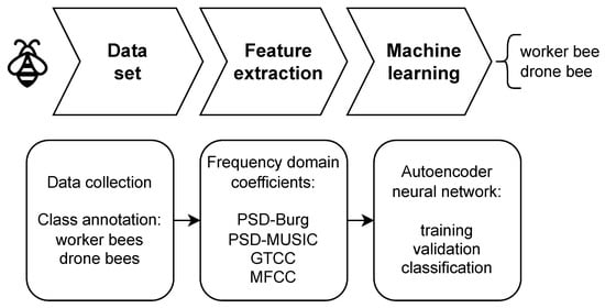 The overall drone bee detection process is split into two main parts: feature extraction by signal preprocessing and classification with the use of autoencoder neural network reconstruction error. The signal processing diagram, including the detection of bees using the autoencoder neural network, is illustrated in Figure 2.