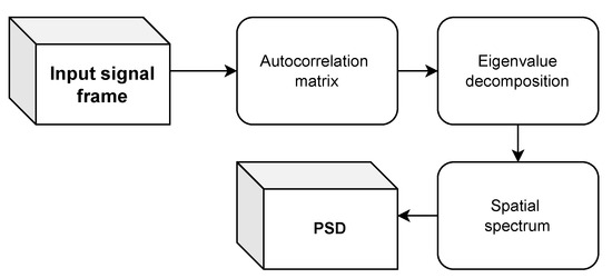 The MUSIC (multiple signal classification) algorithm calculates the pseudospectrum based on a signal or correlation matrix using Schmidt’s eigenspace analysis technique [40]. This method involves analyzing the eigenspace of the correlation matrix of the signal to determine its frequency characteristics, as presented in Figure 3.