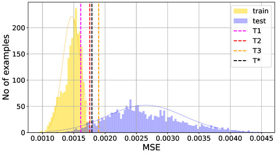 Example of excellent class separation: worker bee (training set), drone bee (test set). Histograms of the MSE loss produced by the autoencoder neural network with marked threshold values T1, T2, T3, and T*.
