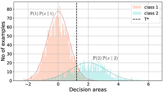 The proposed maximum likelihood threshold T* is a numerically obtained threshold that separates the decision areas of the classifier in the optimal way—see Figure 9. The application of the T* threshold to autoencoder reconstruction error is, in fact, producing an empirical version of the Bayes classifier with the smallest probability of misclassification. In theory, the misclassification probability for the Bayes classifier with full probabilistic information about distributions in classes is the lowest for all classifiers, hence the optimal name. In practice, when the probability distributions in the decision rule (11) must be exchanged with the empirical histograms obtained for the dataset, the misclassification rate will remain the lowest, and at the same time, the complementary accuracy will be the highest. The accuracy results shown in Table 1 confirm the theoretical property of the Bayes classifier for our data. The accuracy for the optimal threshold T* was greater than 99.6% in most cases, except for two: for the Burg and MUSIC preprocessing methods and the neural network structure NN1 with only one hidden layer. The high-dimensional signal representations in the form of 512-dimensional vectors, encoded by only one hidden layer of the neural network, were not as sufficient as encoders with 2, 3, and 4 hidden layers. The optimal threshold T* gives accuracy close to 100%, which means that the classes of worker bees and drone bees, represented by feature vectors obtained by the described methods, are highly separable.