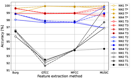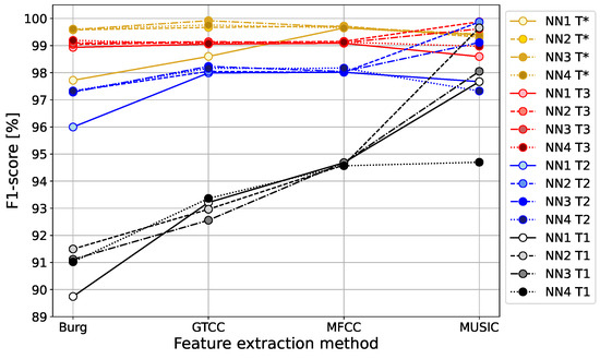 The highest variability of the results can be seen for the standard threshold T1, for which the best performance was obtained for MUSIC feature extraction, followed by the Burg method in second place. Both spectral methods were significantly more accurate for all autoencoder structures compared to the cepstral methods, GTCC and MFCC, for which the results were several percentage points lower. For the 2-sigma threshold T2, and the 3-sigma T3, we observe much smaller variability in the results between all four feature extraction methods, mainly varying in the range 96.87–99.86%.