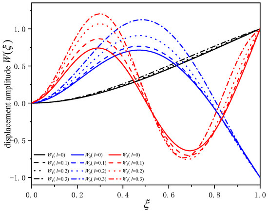 l, the greater the change in beam amplitude and the more obvious the vibration effect. It is worth noting that nonlocal effects could also cause changes in the positions where the amplitude of the beam is zero (i.e., the modal node). Taking the second-order mode (blue curves) as an example, the modal node position moved from