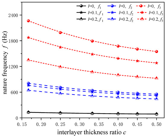 In order to further demonstrate the effect of the nonlocal parameter on the natural frequency of a composite cantilever beam with different transverse dimensions, the first three orders of natural frequencies with different layer thickness ratios