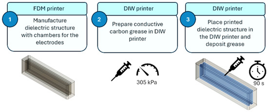 Deposition of conductive carbon grease was performed using DIW on a Cellink Inkredible+ printer [40]. As the deposition was performed at specific points on the dielectric structure, the position of the nozzle was static and a pressure of 305 kPa was set to ensure continuous flow of the conductive grease. A 20-gauge nozzle syringe with an external diameter of 0.91 mm and a length of 12.7 mm was selected based on conductive grease viscosity (80.4 Pa*s) [41] and approximate particle size (~100 µm). Experimentation with nozzle sizes and pressures showed that the 20-gauge nozzle and 305 kPa of applied extrusion pressure were optimal for continuous flow of grease [42].