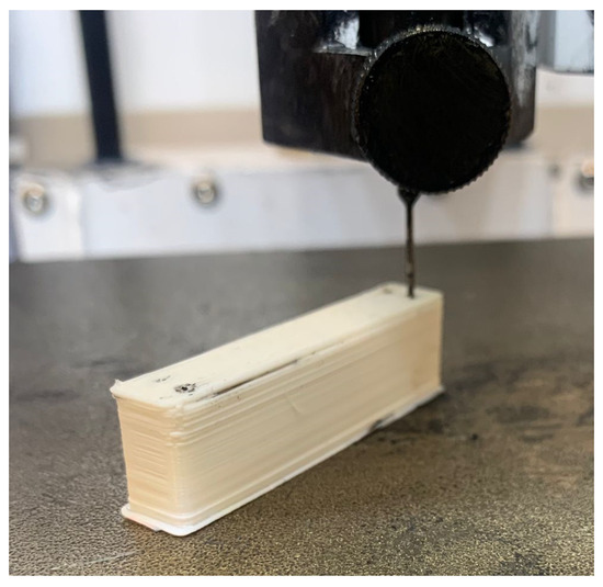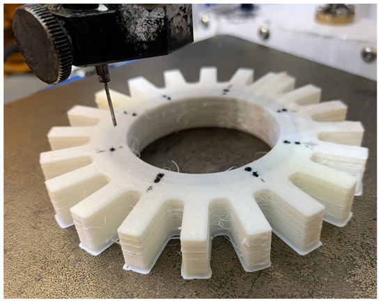 The print was paused before the top two layers were made and the actuator was placed on the bioprinter for the injection of conductive grease. In this case, eight injection points were defined, and the grease flowed for 90 s for each point at a pressure of 305 kPa. Subsequently, the two remaining layers of the print covered the holes. Figure 5 shows the process of injecting the grease in Prototype 2.