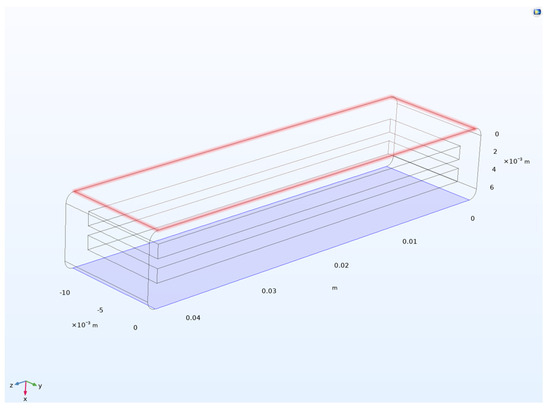 The geometry of the structure was imported directly from the 3D-printer STL file. Then, each of the physics for the model were added, including solid mechanics, electrostatics, and electromechanics. As per the solid mechanics module, a fixed constraint and a boundary load were set at the bottom and top of the structure (blue and red highlighted in Figure 6). The boundary load was in the form of a sweep ranging from 0 to 60 psi (0 to 413.69 kPa) with a step of 1 psi (6.89 kPa). The sweep function enabled convergence before movement to the next step due to high deformation, which results from the hyperelastic behavior of the material.