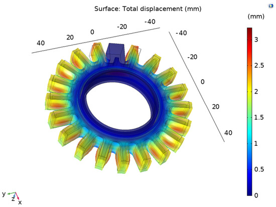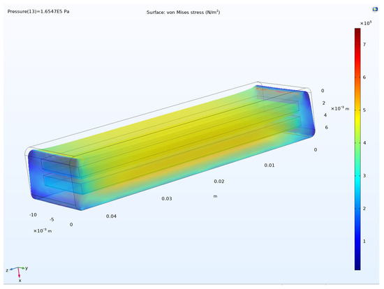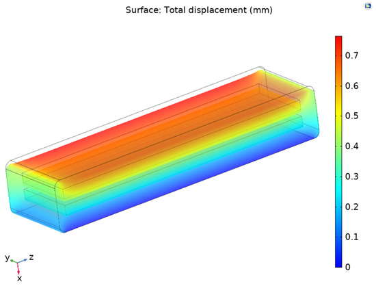 Figure 13 shows the von Mises stress of the structure. The maximum stress is below 1 MPa, corresponding to a low-stress condition. For better visualization, stresses below 0.78 MPa are shown in Figure 13.