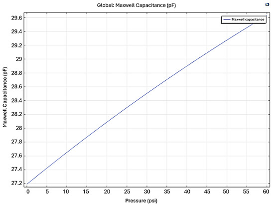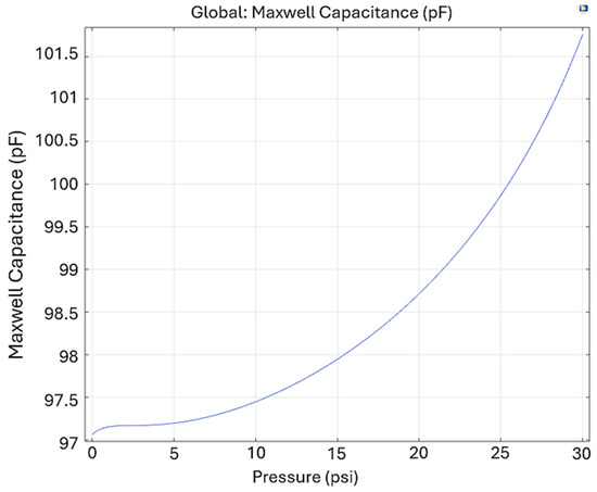 The deformation produces an increase in capacitance, and the Maxwell capacitance versus the applied pressure is shown in Figure 9. The increase in capacitance corresponds to an increase in the applied pressure, which demonstrates the functionality of the structure as a sensor.
