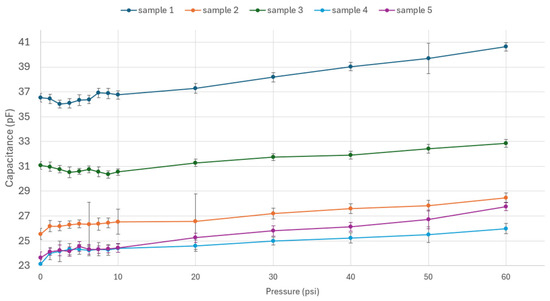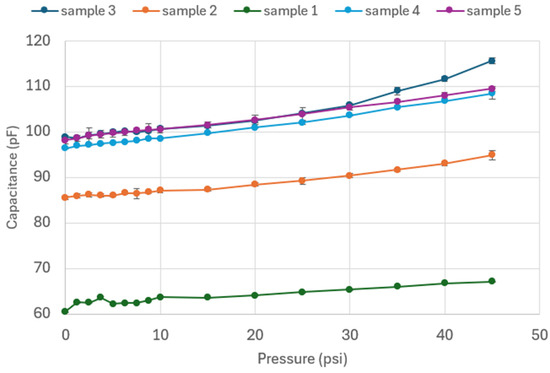 Figure 16 shows the results of the experiments conducted on Prototype 1, focusing on the sensor structure. These results show an increase in capacitance as the pressure increases for all five samples. For samples 2, 4, and 5, the pressure increases notably from rest to 1 psi (6.89 kPa), followed by an increasing behavior. For samples 1 and 3, no clear trend was observed for the first 10 psi (68.95 kPa), which might be attributed to the uneven distribution of the pressure over one face of the structure, given that the chambers were filled with extra carbon grease, generating expansion on the entire structure. An excess of carbon grease can also explain the higher ranges in capacitance for samples 1 and 3.
