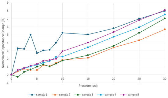 Normalizing the capacitance change allows for a direct comparison among different samples, given that the value of capacitance in the initial condition varies, as observed in Figure 16. The values of normalized capacitance as a function of the applied pressure for Prototype 1 are shown in Figure 17. For all the samples, an increase is observed between 7 and 23% of their initial capacitance value. These percentages are lower compared to those obtained in a previous study [2,5], where three types of conductive TPU were used as electrodes, with initial capacitance changes between 71 and 141%.