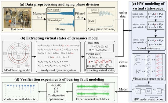 This study presents a bearing fault modeling method based on virtual states and the HW model. The approach involves analyzing the 5-DoF dynamic model of bearings to identify suitable virtual states and input–output configurations, which are then used to establish virtual state-space models. Bearing vibration signals collected by acceleration sensors under various working conditions are employed in the experiments. Extensive testing of HW modeling configurations result in highly accurate bearing dynamics models, validating the effectiveness of the proposed method. The key contributions of this work can be summarized as follows: