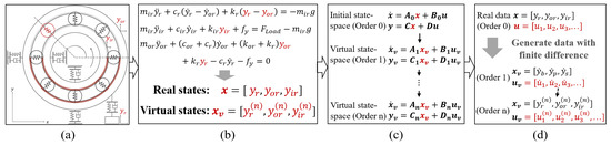Construction process of virtual state and virtual state-space: (a) 5-DoF model, (b) dynamics analysis, (c) virtual state generation, (d) virtual state-space construction.