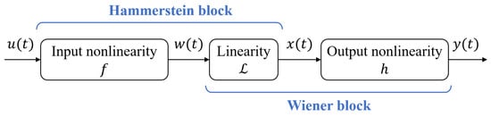 The HW model can serve as a black-box for estimating linear models, with its accuracy enhanced by incorporating nonlinearities in the inputs and outputs. It can also function as a grey-box model that captures physical process characteristics. As illustrated in Figure 6, the HW model simplifies a complex nonlinear dynamic system into two static nonlinear blocks, f and h, in series with a linear block , where and represent the input and output data, respectively. The the linear block’s input and output are denoted as and . The model structure is mathematically described by Equations (16)–(18):