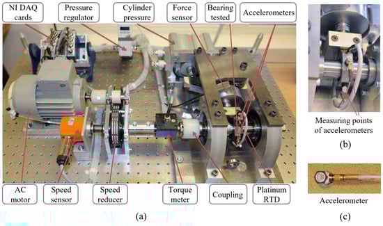 Test bench and sensors: (a) the PRONOSTIA platform, (b) measuring points in vertical and horizontal directions, (c) accelerometer.