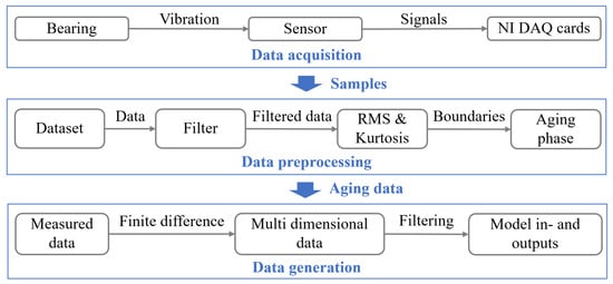 Simultaneously, filtering the generated data can help mitigate the adverse effects of using finite differences to calculate derivatives. The entire workflow for utilizing virtual state-space in bearing fault modeling is depicted in Figure 5.