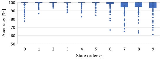After excluding outliers using the three-standard deviation method, the precision of the MISO-HW model constructed for Bearing consistently exceeds 90%. As detailed in Table 9 corresponding to Figure 10, the average precision across all state orders surpasses 93.72%, with relatively small standard deviations. Notably, for virtual state-space models with orders less than three, the modeling precision exceeds 98.29%, with a standard deviation within 3.64. This suggests that lower-order virtual state-space models may better capture the system’s dynamics. In conclusion, this modeling approach proves to be effective for Bearing .