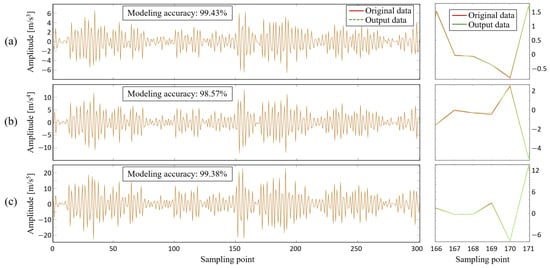As a supplementary analysis, Figure 11 compares the original signal (in red) from the virtual state-space model for a single sample of Bearing with the HW model output signal (in green). The right side of the figure provides an enlarged comparison of six sampling points, where the high modeling accuracy results in a significant overlap between the two curves. Therefore, additional comparison plots with greater precision are presented in the Appendix A, as shown in Figure A1. The nearly identical trends and values of both signals further validate the efficacy of this modeling approach.