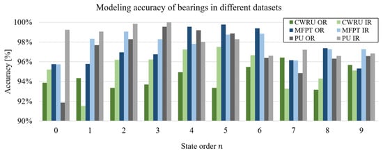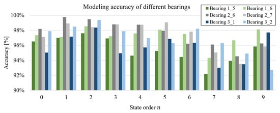 Considering model dimensionality in Figure 14, the highest accuracy for each bearing is predominantly achieved at state orders 4 and 6. However, in Figure 12, the peak accuracy is concentrated at state orders 0 to 2. The data in Figure 12 are derived from healthy bearings in the aging stage, while Figure 14 reflects data from faulty bearings. This distinction suggests that the bearings in Figure 14 exhibit more significant dynamic nonlinearity and signal complexity. Thus, a higher-dimensional model is necessary to accurately capture these bearing faults’ dynamic characteristics, reinforcing the research value and motivation behind the proposed method.