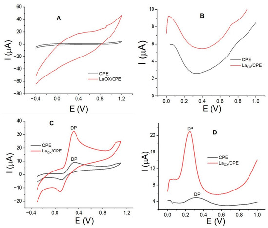 In the case of the electrodes without DP (Figure 1A,B), it is clear that the presence of La2O3 does not exhibit electroactivity between 0.0 and 1.0 V, creating a clean baseline that does not interfere with the DP signal. However, an increase in the background current is evident for the modified electrode, which is likely attributable to the increased active surface area of the electrode.